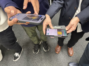 グループで考えた案内文を松井教授がサーバに登録すると、アプリを使って実際に点字ブロックごとの音声を聞くことができます。